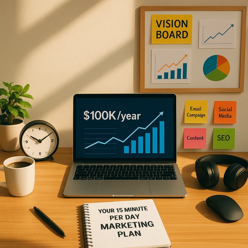 How can I use a 15 minute per day marketing plan to reach $100K per year in revenue?